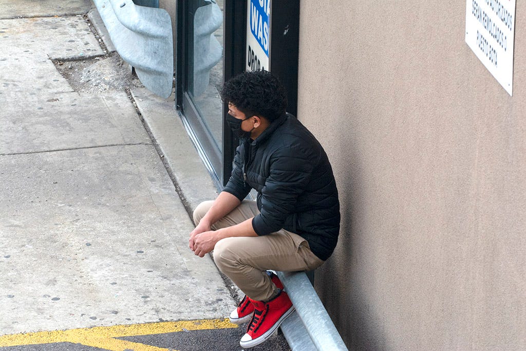A young man waits outside a laundromat in Chicago. Photo by Dominic Gwinn