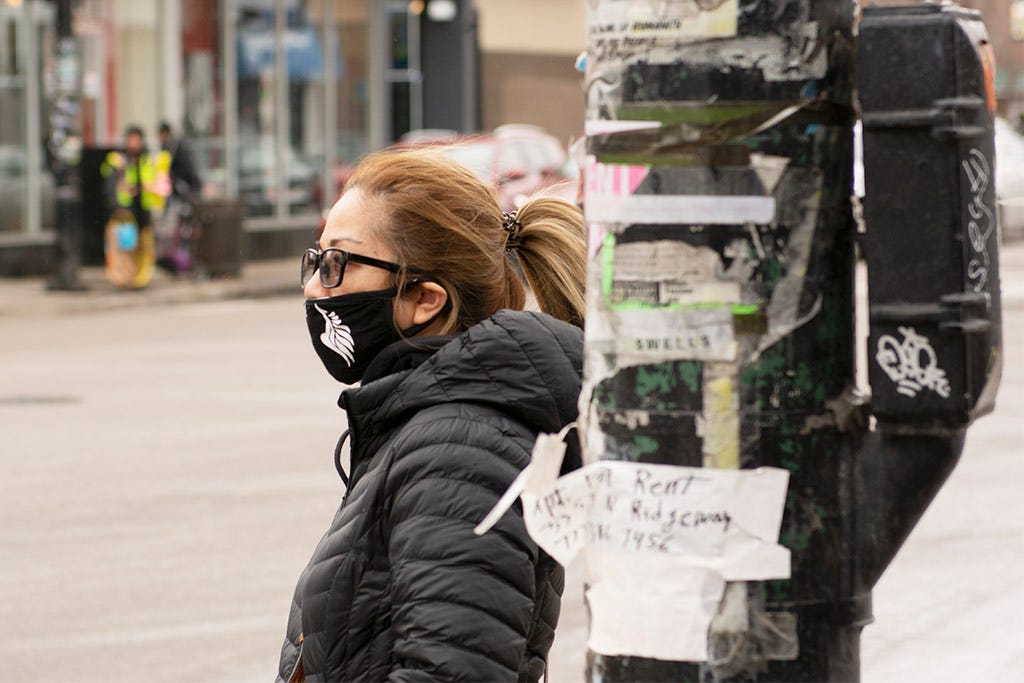 A woman in Chicago waits to cross a street during the COVID-19 pandemic.