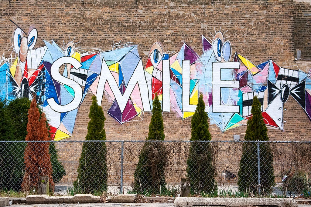 A tree-lined mural in Chicago reads, “Smile.” Photo by Dominic Gwinn